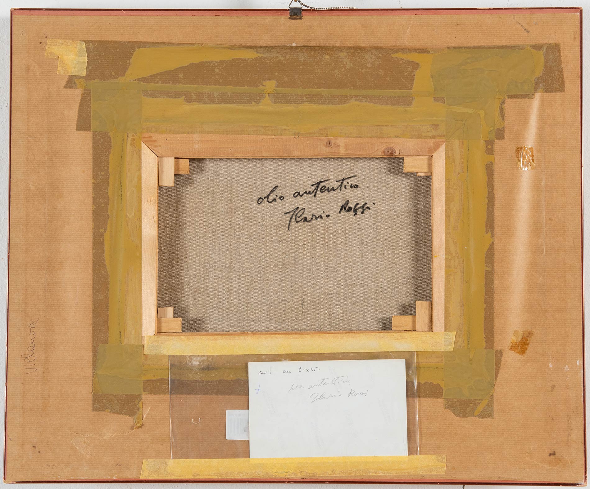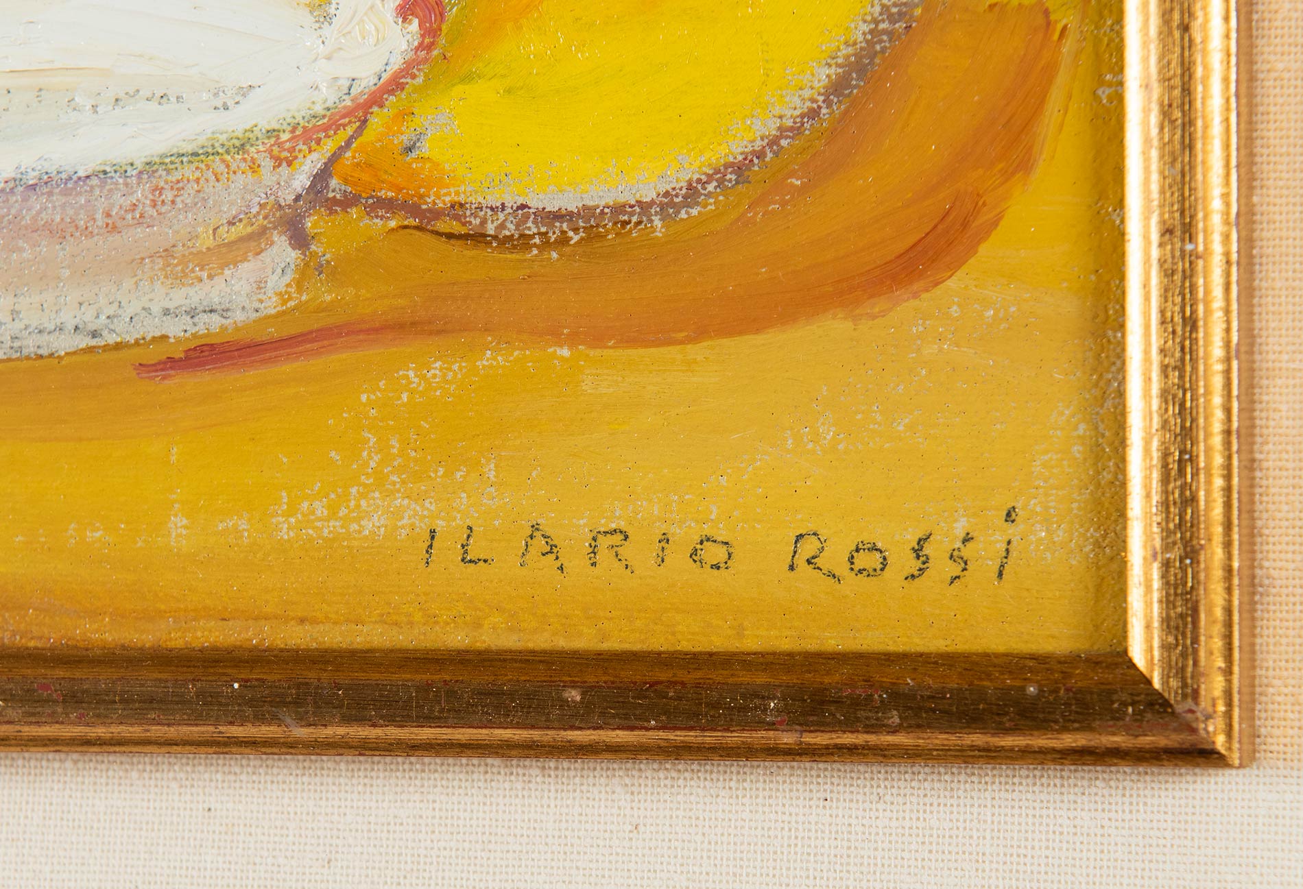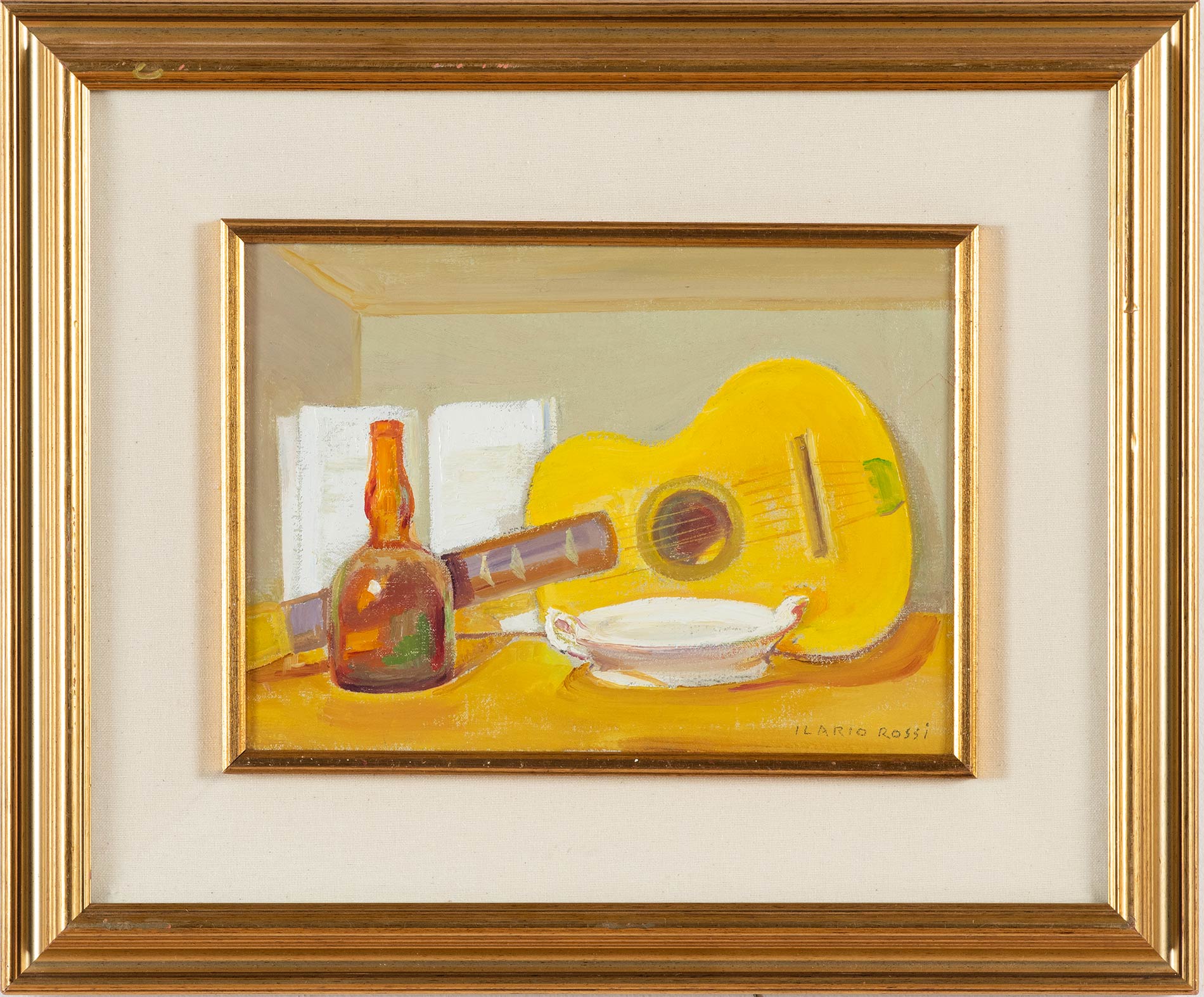 Ilario Rossi (Bologna 1911 – 1994), “Natura morta con chitarra”. Olio su tela, firmato in basso a destra Ilario Rossi, al retro iscrizione per autentica ‘Olio autentico/Ilario Rossi’, H cm 25x35 Opera accompagnata da certificato di autenticità su fotografia a firma dell’artista.