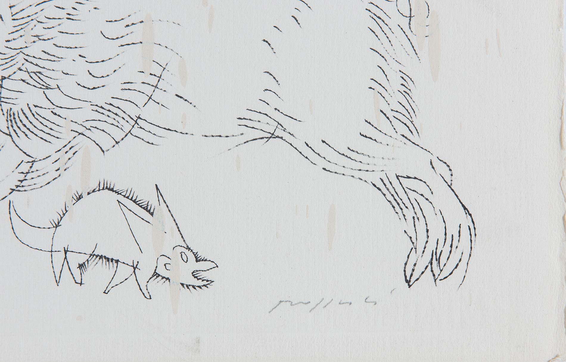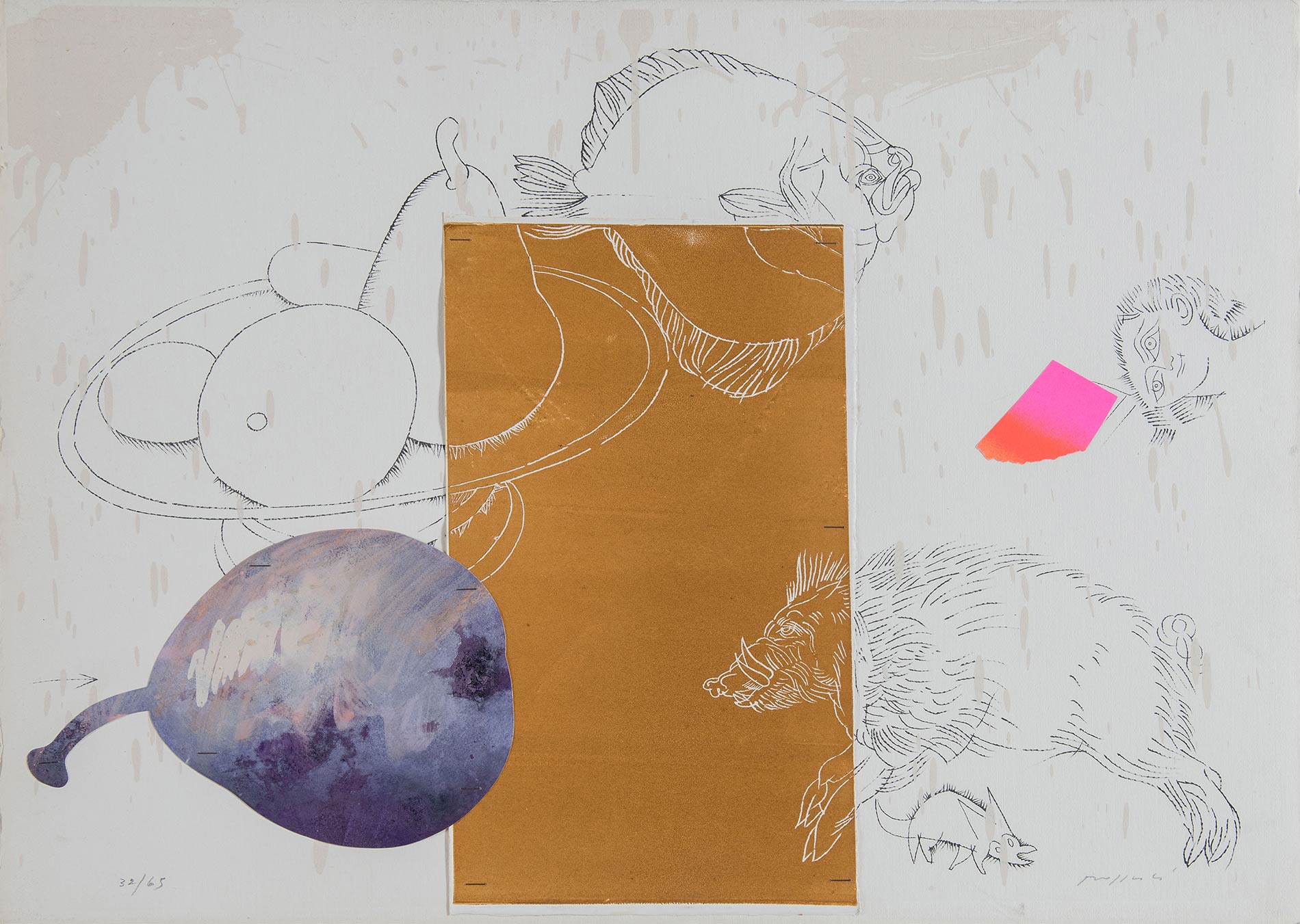 Concetto Pozzati (Vo' 1935 – Bologna 2017), “Senza titolo”. Litografia e collage su carta, firmata in basso a destra Pozzati, numero di tiratura in basso a sinistra 32/65, H cm 52.5x72.5