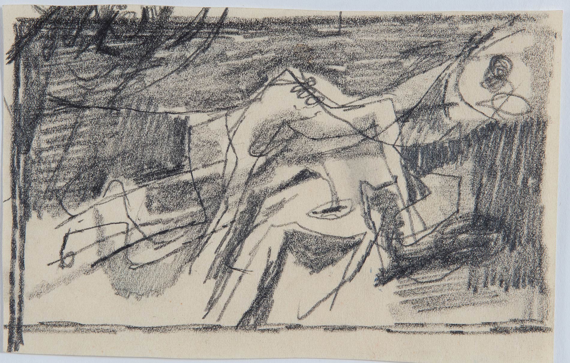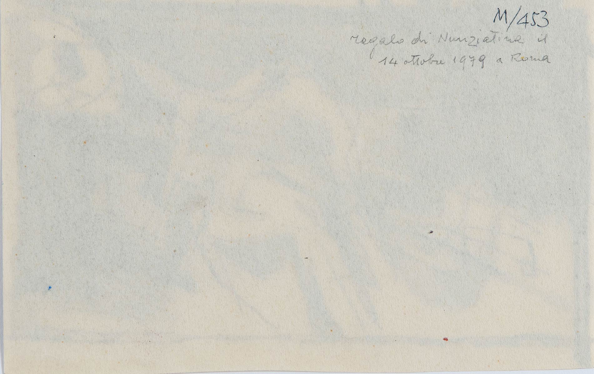 Afro Basaldella (Udine 1912 - Zurigo 1976), 'Composizione'. Matita su carta, al retro reca iscrizione ‘M/453’ e dedica ‘Regalo di Nunziatina il/14 Ottobre 1979 a Roma’, H cm 9x14 Provenienza: Collezione Aldo Merlo - Udine. Aldo Merlo nacque a Pontebba (Udine) il 26 maggio 1911. Negli anni Sessanta si trasferì a Roma dove si accostò alla pittura da autodidatta, frequentando gli ambienti artistici udinesi della Scuola friulana d’avanguardia fondata da Modotto nel 1928, di cui facevano parte i fratelli Basaldella, Filipponi, Grassi, Pittino, Max Piccini. Strinse un saldo rapporto d’amicizia con Afro Basaldella col quale fu allievo della Scuola Ufficiali a Spoleto dove incontrò il pittore Corrado Cagli. Rientrarono quindi a Udine al 2° Fanteria: due caricature suggellano questo momento della loro comune vita militare, un ritratto di M. e un autoritratto dipinti da Afro sulle ante di un armadio (collezione privata). Da militare partecipò alla campagna d’Etiopia, fu in Tripolitania e nel secondo conflitto mondiale in Croazia, guadagnandosi una medaglia di bronzo al valore. Rientrato a Udine, nel dopoguerra frequentò Zigaina e gli altri artisti del gruppo neorealista di Vicolo Florio. M. posò come modello per Afro nel dipinto Pastore presentato alla Biennale di Venezia del 1936, anno in cui Basaldella firmò anche il Ritratto di Aldo Merlo, esposto alla personale presso la Galleria della Cometa di Roma e riprodotto sulla copertina del catalogo. Nel 1972, per iniziativa di Aldo Merlo in collaborazione con Mario Graziani e Isabella Reale, direttrice della Galleria d’Arte Moderna di Udine, si è proceduto alla redazione del ‘Catalogo Generale Ragionato dei Disegni di Afro’, uscito nel 2006. Fonte: Dizionario Bibliografico dei Friulani.