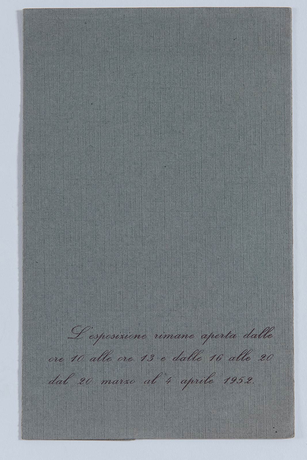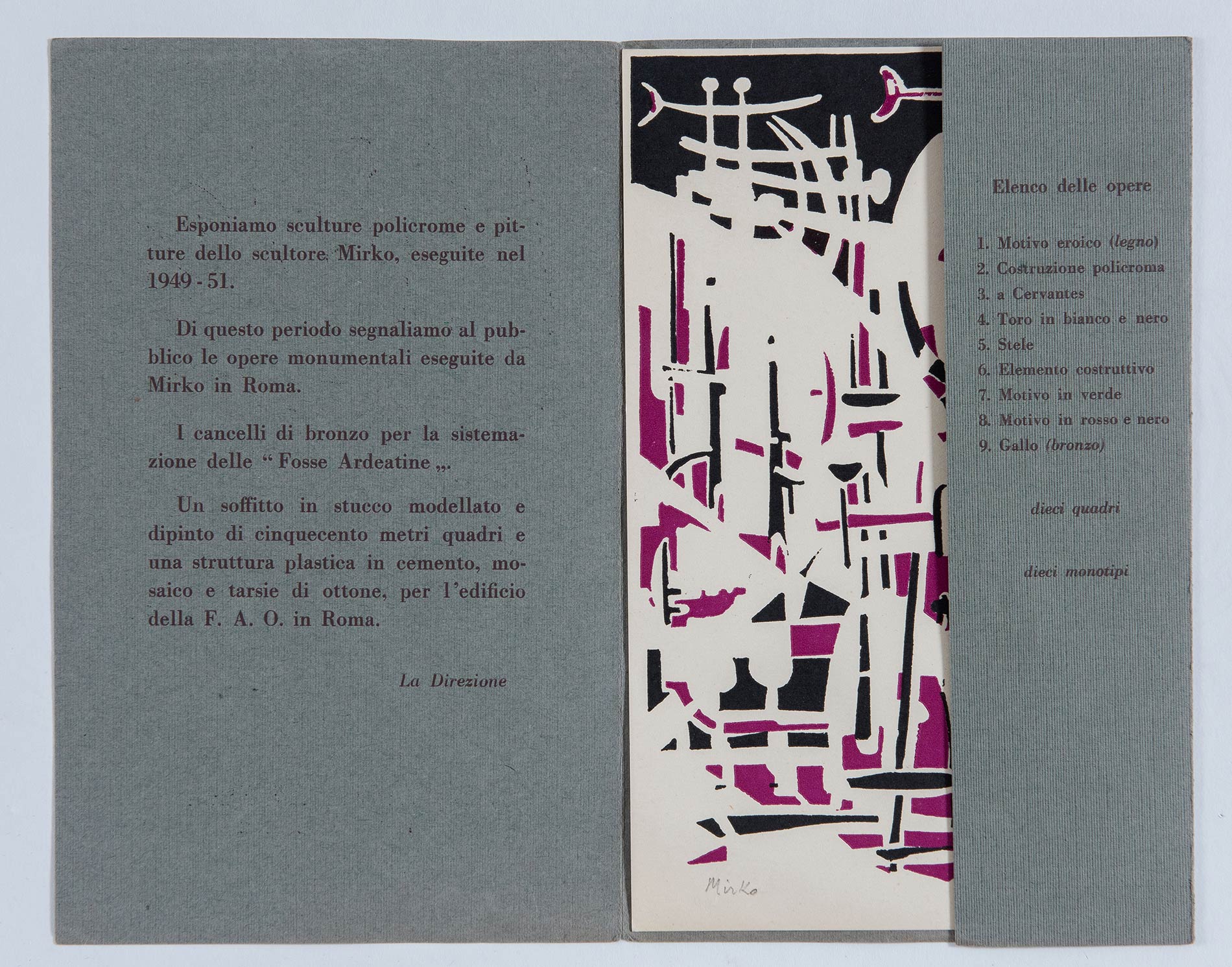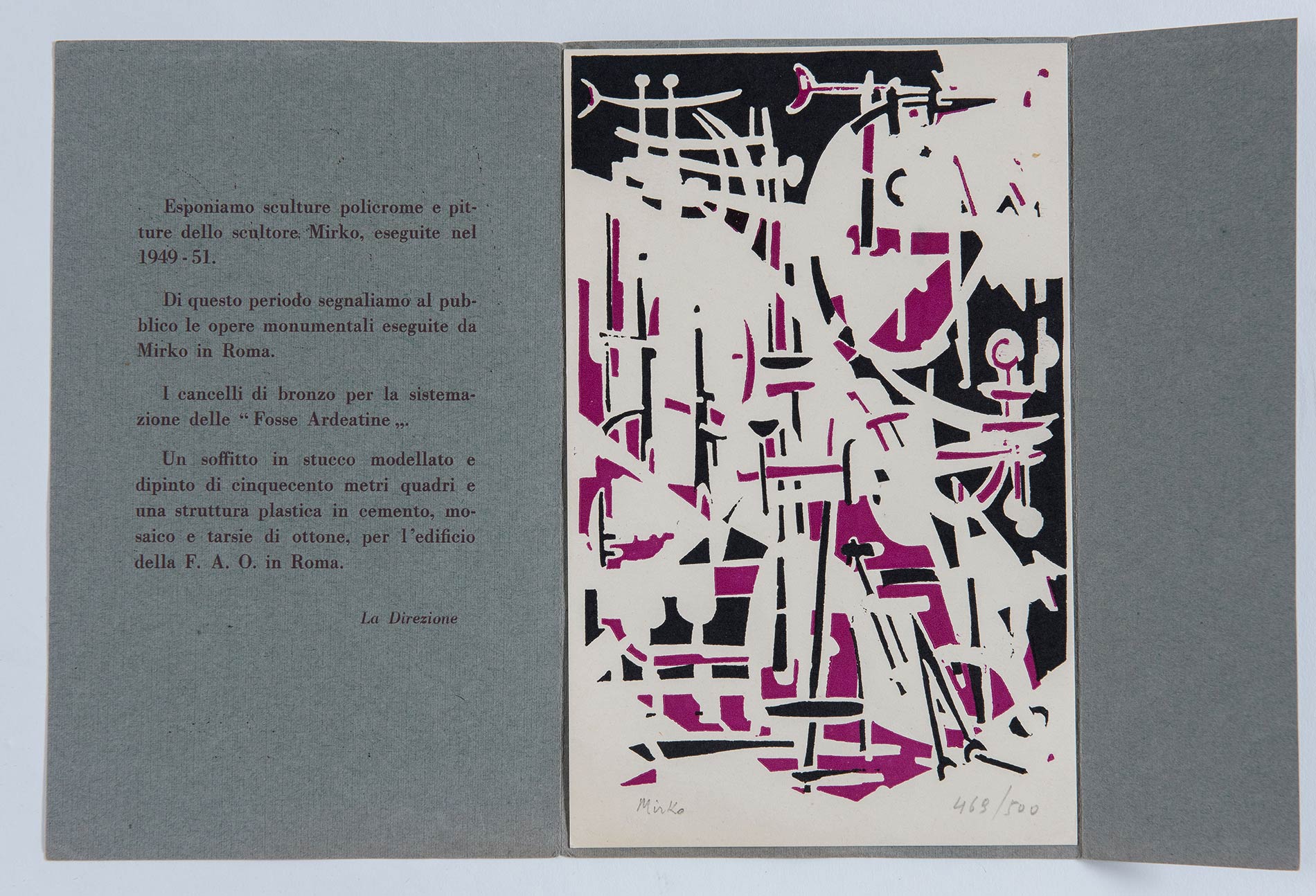 Mirko Basaldella (Udine 1910 – Cambridge 1969), “Senza titolo”. Xilografia su carta, firmata in basso a sinistra Mirko, numero di tiratura in basso a destra 469/500, entro pieghevole della Galleria San Marco – Roma, H cm 13.5x21.5 Pieghevole realizzato per l’Esposizione ‘Mirko’ - Galleria San Marco – Roma, Marzo-Aprile 1952. Provenienza: Collezione Aldo Merlo – Udine. Aldo Merlo nacque a Pontebba (Udine) il 26 maggio 1911. Negli anni Sessanta si trasferì a Roma dove si accostò alla pittura da autodidatta, frequentando gli ambienti artistici udinesi della Scuola friulana d’avanguardia fondata da Modotto nel 1928, di cui facevano parte i fratelli Basaldella, Filipponi, Grassi, Pittino, Max Piccini. Strinse un saldo rapporto d’amicizia con Afro Basaldella col quale fu allievo della Scuola Ufficiali a Spoleto dove incontrò il pittore Corrado Cagli. Rientrarono quindi a Udine al 2° Fanteria: due caricature suggellano questo momento della loro comune vita militare, un ritratto di M. e un autoritratto dipinti da Afro sulle ante di un armadio (collezione privata). Da militare partecipò alla campagna d’Etiopia, fu in Tripolitania e nel secondo conflitto mondiale in Croazia, guadagnandosi una medaglia di bronzo al valore. Rientrato a Udine, nel dopoguerra frequentò Zigaina e gli altri artisti del gruppo neorealista di Vicolo Florio. M. posò come modello per Afro nel dipinto Pastore presentato alla Biennale di Venezia del 1936, anno in cui Basaldella firmò anche il Ritratto di Aldo Merlo, esposto alla personale presso la Galleria della Cometa di Roma e riprodotto sulla copertina del catalogo. Nel 1972, per iniziativa di Aldo Merlo in collaborazione con Mario Graziani e Isabella Reale, direttrice della Galleria d’Arte Moderna di Udine, si è proceduto alla redazione del ‘Catalogo Generale Ragionato dei Disegni di Afro’, uscito nel 2006. Fonte: Dizionario Bibliografico dei Friulani.