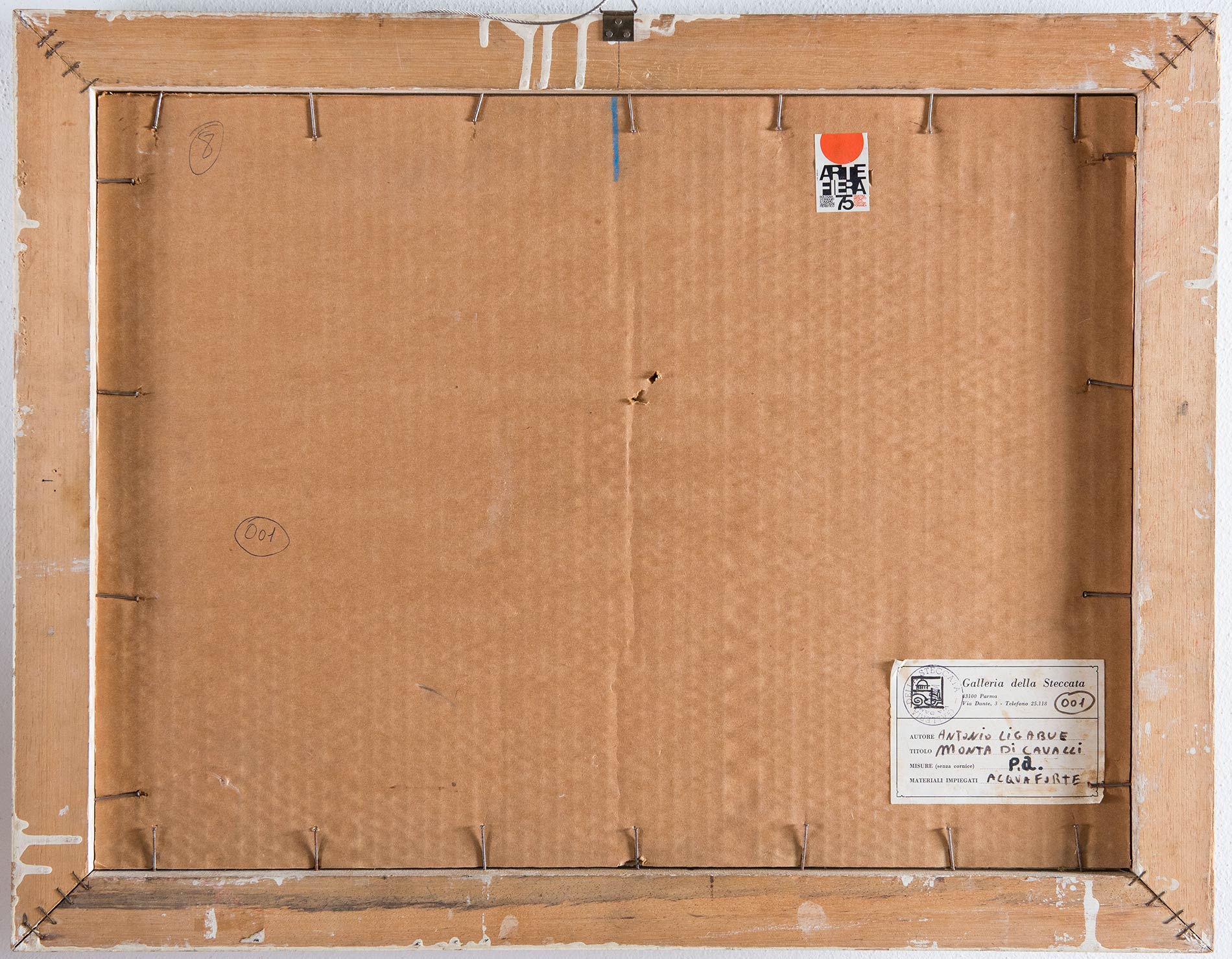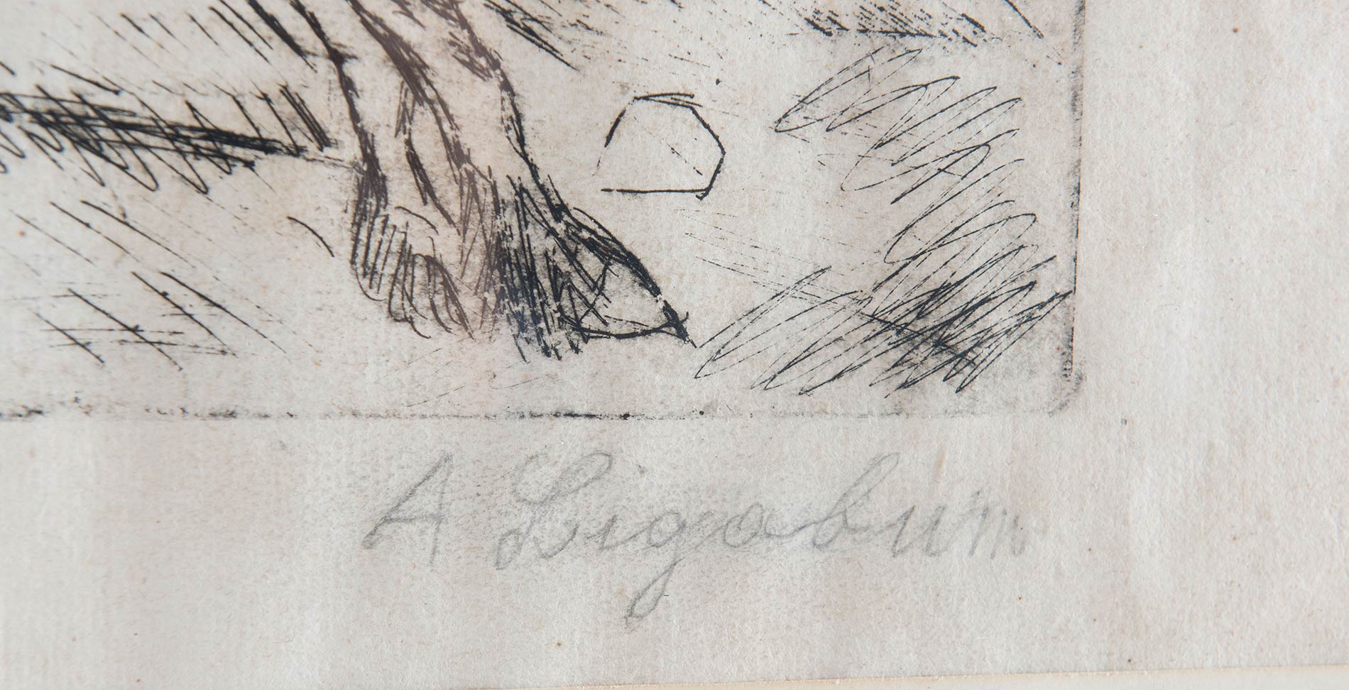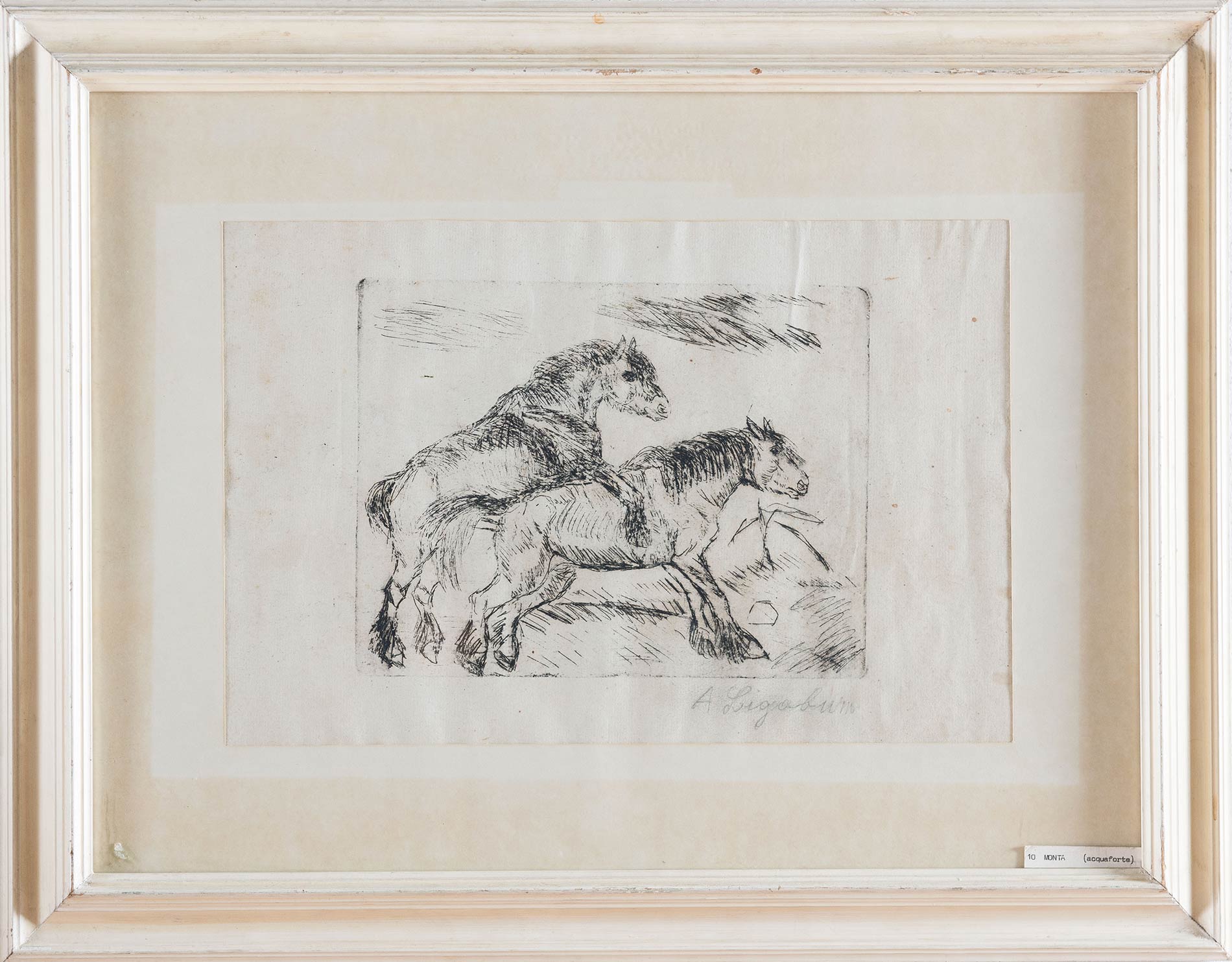 Antonio Ligabue (Zurigo 1899 - Gualtieri 1965), 'Monta di cavalli'. Acquaforte su carta, firmata in basso a destra A Ligabue, Lastra H cm 19x25 - Foglio H cm 40x60 Al retro reca timbro ed etichetta Galleria della Steccata - Parma e etichetta Artefiera 75.