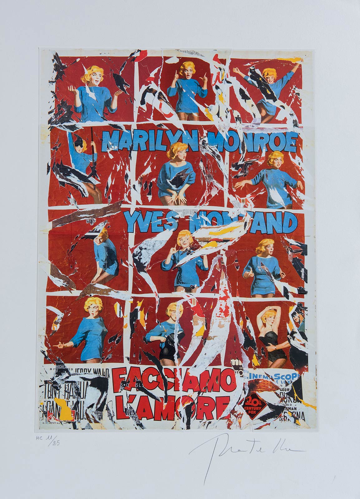 Domenico "Mimmo" Rotella (Catanzaro 1918 – Milan 2006 ), “Gioco con certi colori”. Serigrafia decollage a mano su carta, firmata in basso a destra Rotella, numero di tiratura in basso a sinistra HC 11/25, Lastra H cm 36.5x27 – Foglio H cm 50x70 Accompagnato da poesia di Alda Merini.