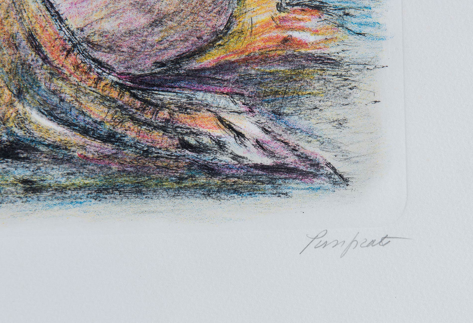 Domenico Purificato (Fondi 1915 – Roma 1984), “Donne in riva al lago”. Litografia a colori su carta, firmata in basso a destra Purificato, esemplare p.d.a., Lastra H cm 58x39 – Foglio H cm 69.5x50 Bibliografia di riferimento: Opera pubblicata in ‘Purificato Opera Grafica’, Domenico Guzzi, Edizioni d’Arte La Vite, n. 31.