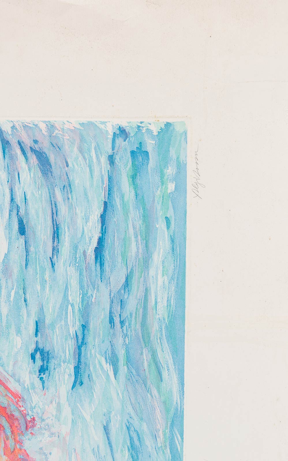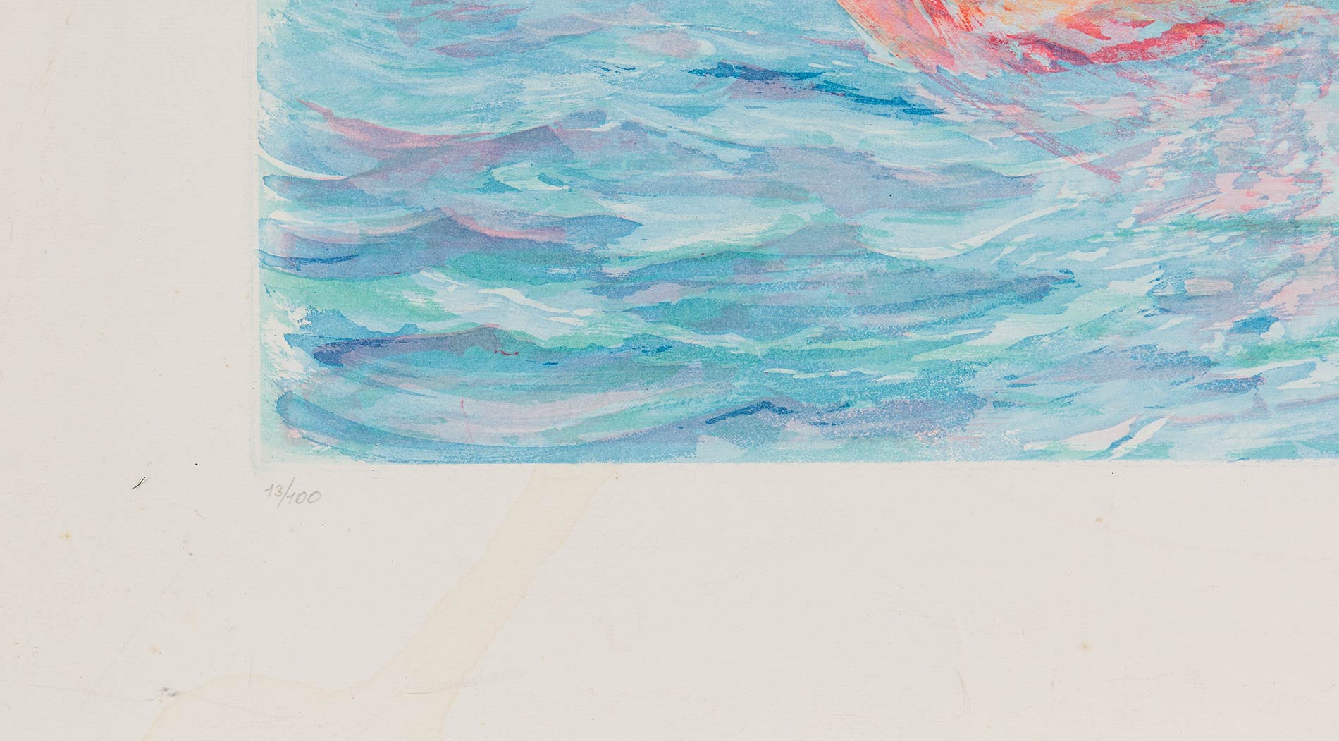 Aligi Sassu (Milano 1912 – Pollença 2000), “La Dragonera”. Acquaforte - acquatinta a colori su carta, firmata in basso a destra Aligi Sassu, numero di tiratura in basso a sinistra 13/100, timbro a secco in basso a destra, Lastra H cm 45x64 – Foglio 64.5x86 Opera accompagnata da certificato di autenticità della Galleria Arte Bologna Zanarini, con n. archivio 1322.