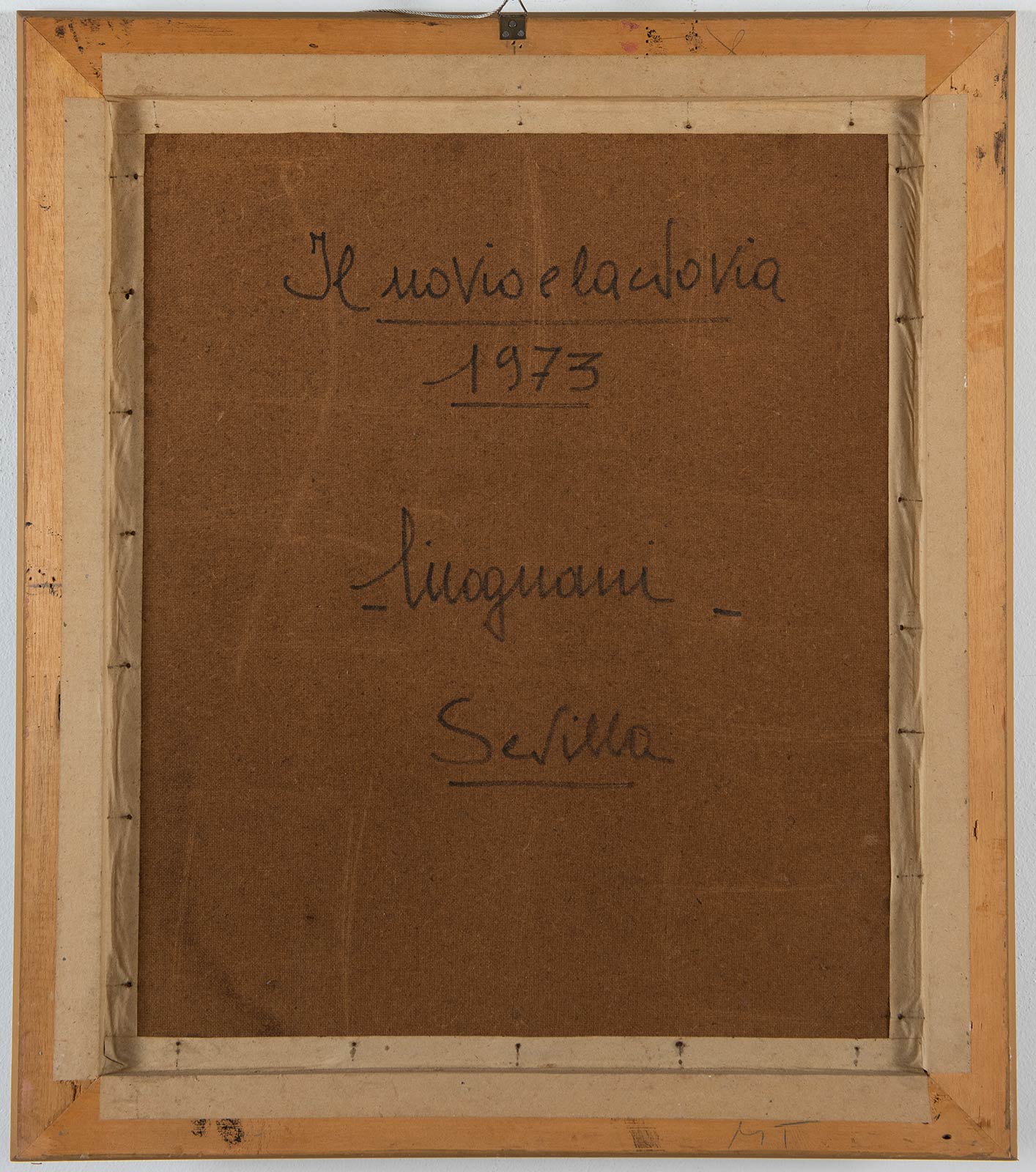 Corrado Cicognani (Bologna 1919 – 1992), “Il novio e la novia”, 1973. Olio su masonite, siglato in basso a destra, titolato, datato e firmato al retro ‘Il novio e la novia/1973/Cicognani/Sevilla’, H cm 58x48.5