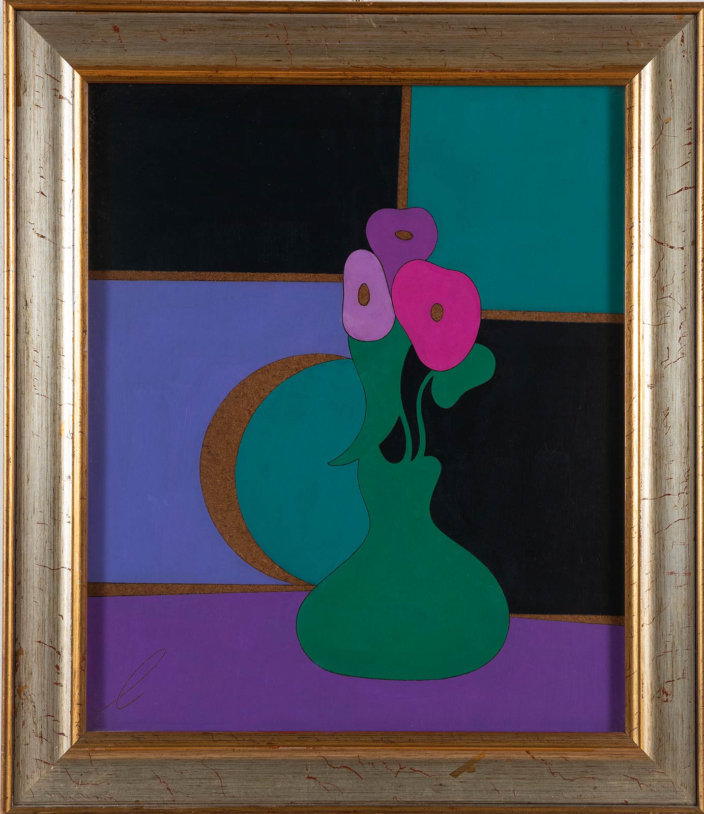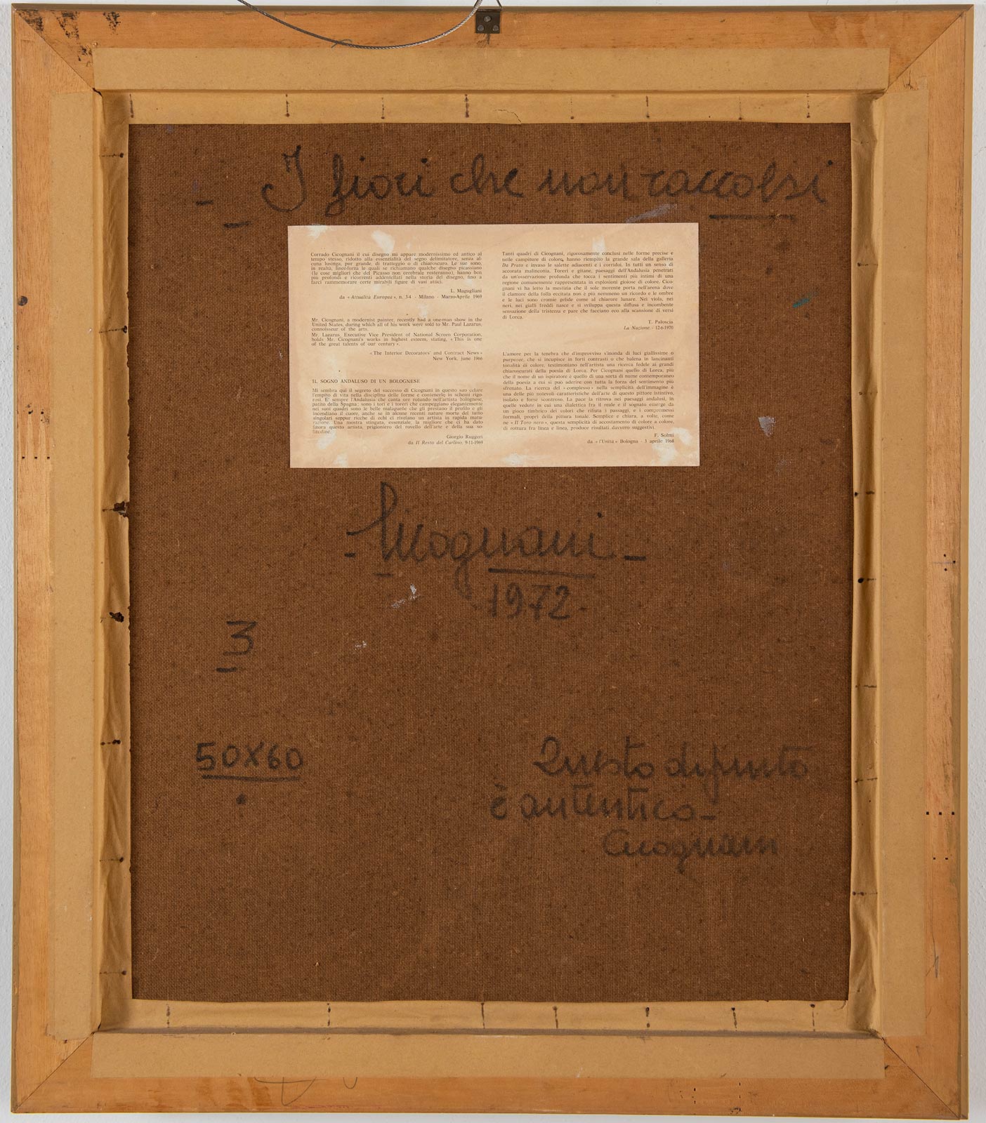 Corrado Cicognani (Bologna 1919 – 1992), “I fiori che non raccolsi”, 1972. Olio su masonite, siglato in basso a destra, titolato, datato e firmato per autentica al retro ‘I fiori che non raccolsi/Cicognani/1972/Questo dipinto è autentico/Cicognani’, al retro reca etichetta, H cm 58x48.5