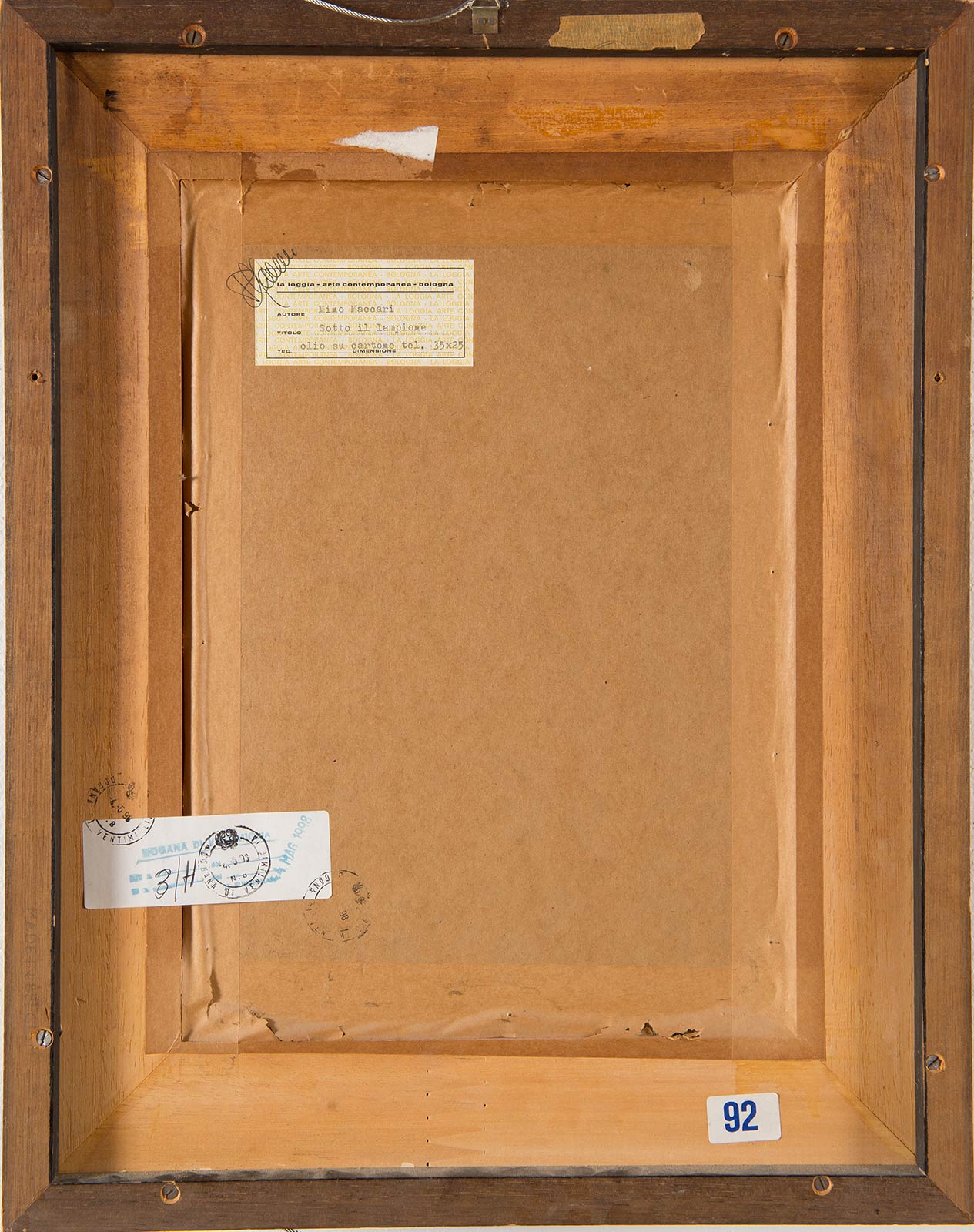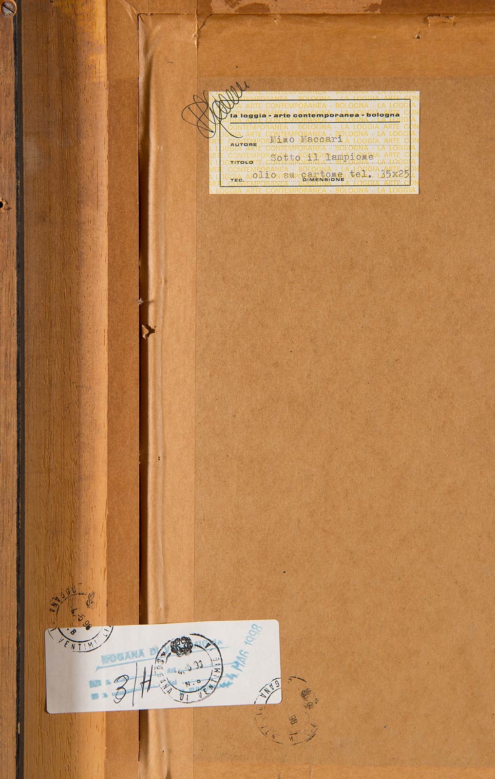 Mino Maccari (Siena 1898 – Roma 1989), “Sotto il lampione”, Anni ‘70. Olio su cartone telato, firmato in basso a sinistra Maccari, H cm 35x25 Al retro reca etichetta Galleria La Loggia – Arte Contemporanea – Bologna. Al retro reca etichetta e timbri Dogana di Ventimiglia in data 4 Maggio 1998. Opera accompagnata da certificato di autenticità dell’Archivio delle Opere del Maestro Mino Maccari a firma Marco Maccari e data 29/12/98. Provenienza: Collezione Privata – Bologna.