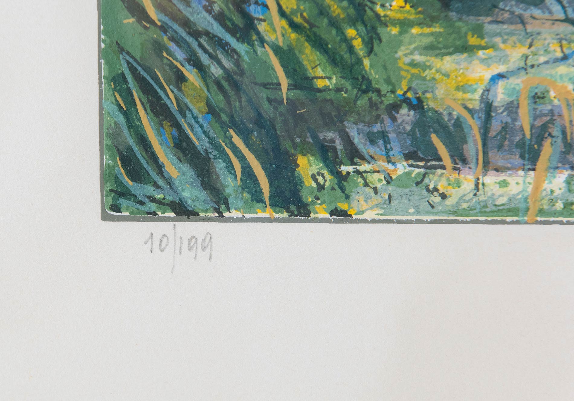 Michele Cascella (Ortona 1892 – Milano 1989), “Paesaggio con casolare”. Litografia a colori su carta, firmata in basso a destra M. Cascella, numero di tiratura in basso a sinistra 10/199, Lastra H cm 50x60 – Foglio 66x85