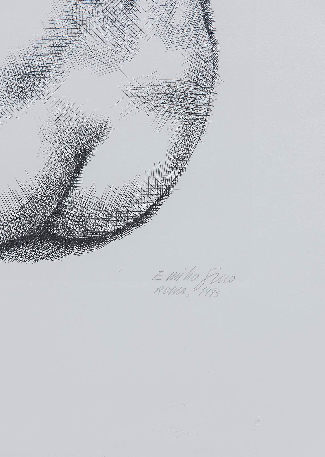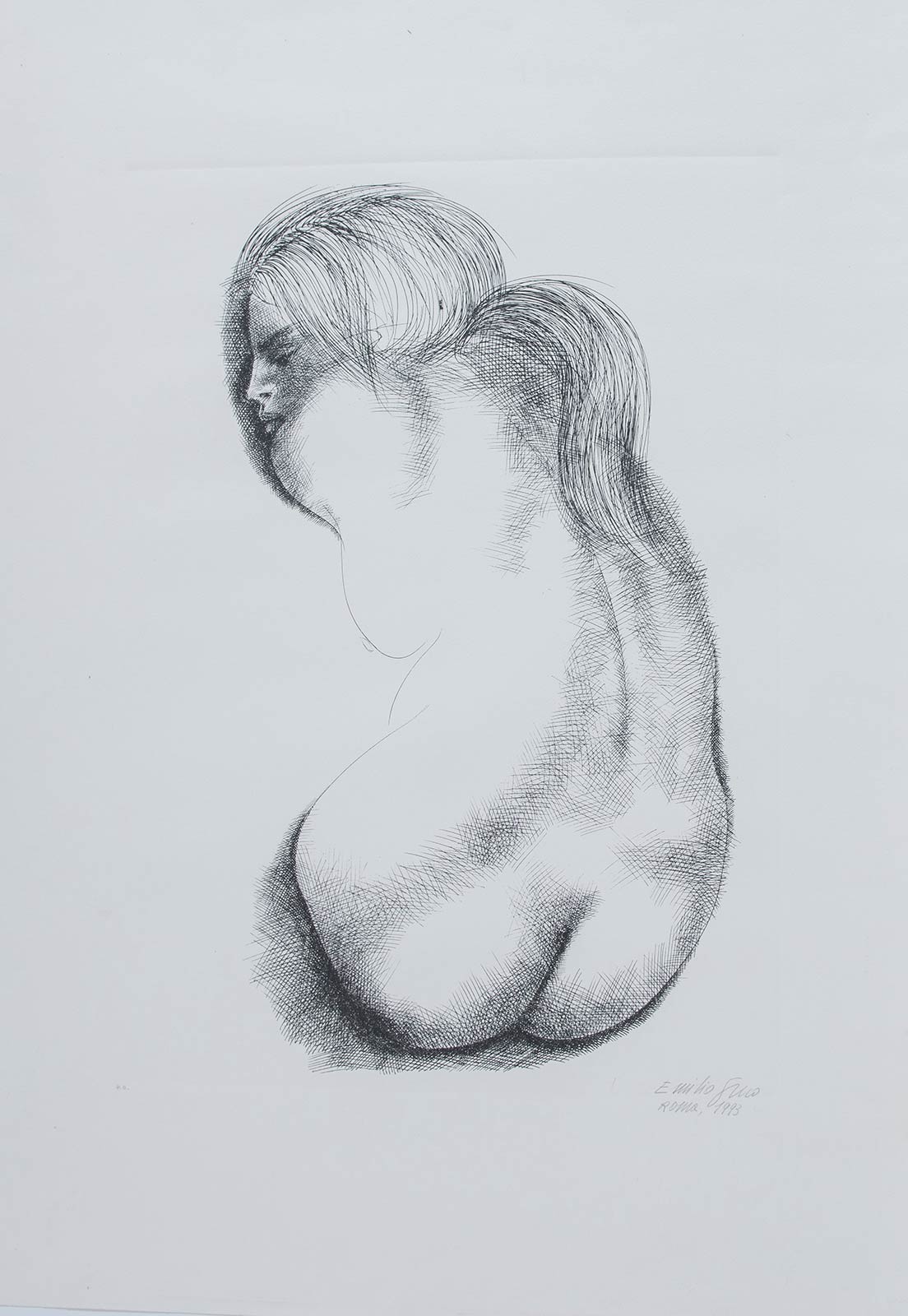 Emilio Greco (Catania 1913 – Roma 1995), “Nudo femminile”, 1993. Litografia su carta, firmata e datata in basso a destra Emilio Greco Roma 1993, esemplare p.a., timbri a secco in basso a destra ‘Acquaforte da un disegno originale di Emilio Greco’ e PA, Lastra H cm 67x48 – Foglio H cm 100x70