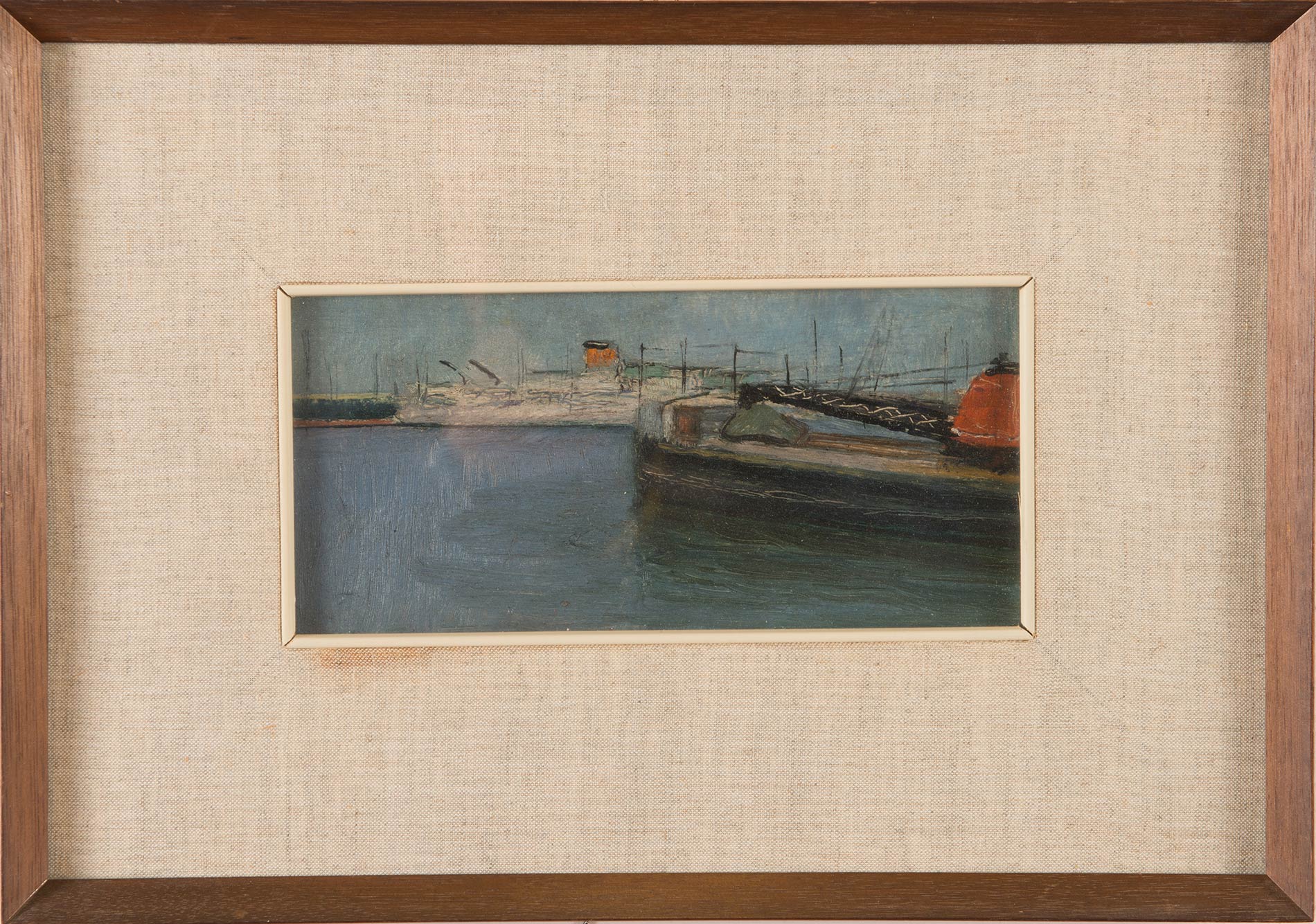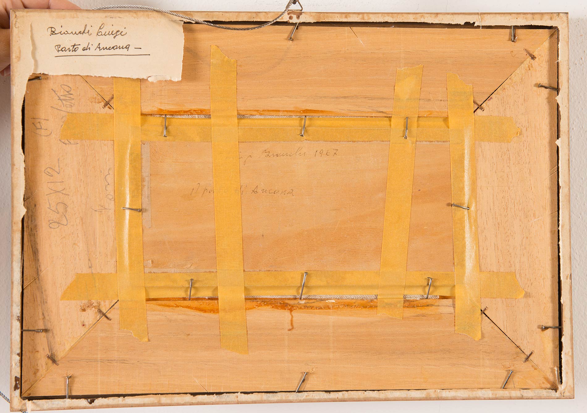 Luigi Bianchi (Bologna 1911 – 1994), “Il porto di Ancona”, 1967. Olio su tavola, firmato, datato e titolato al retro ‘Luigi Bianchi 1967 – Il porto di Ancona’, H cm 12x25