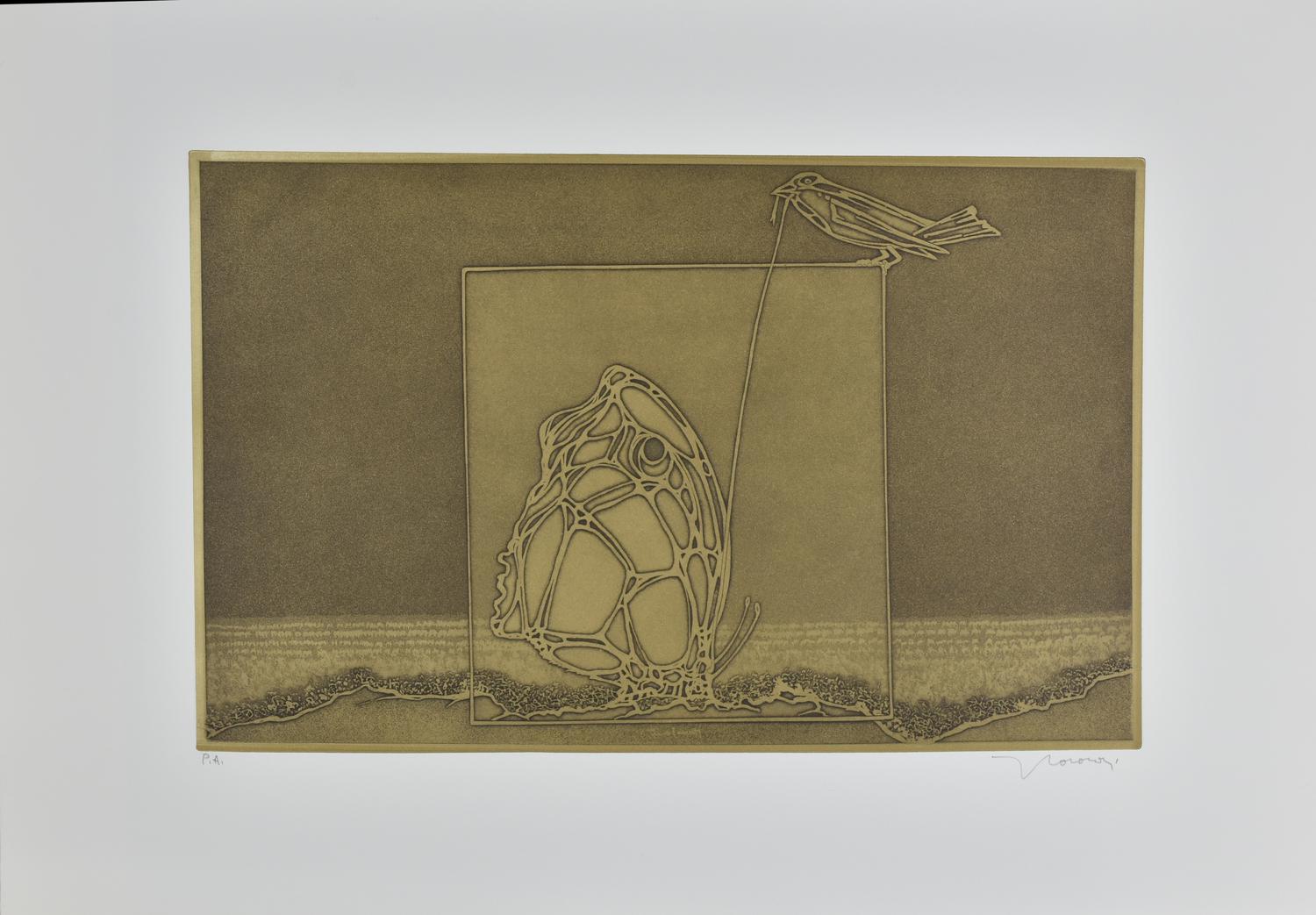 Francesco Casorati FARFALLA E UCCELLO incisione su carta, battuta cm 32x49,...