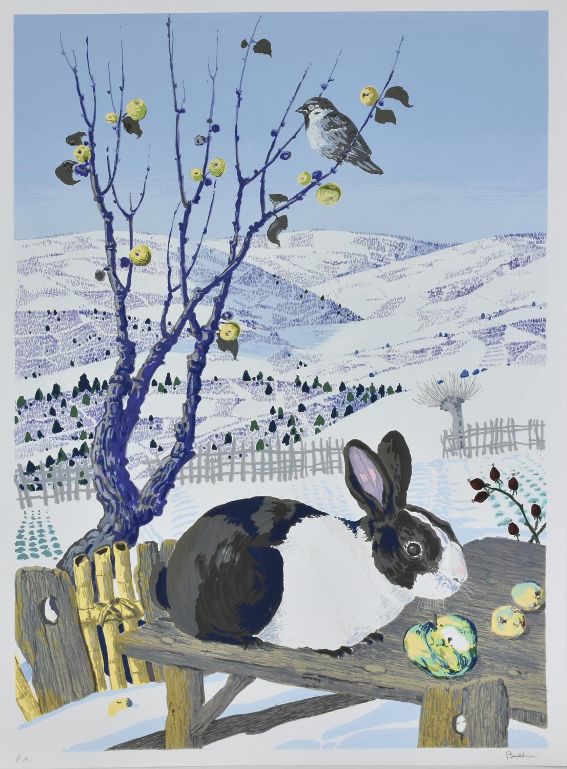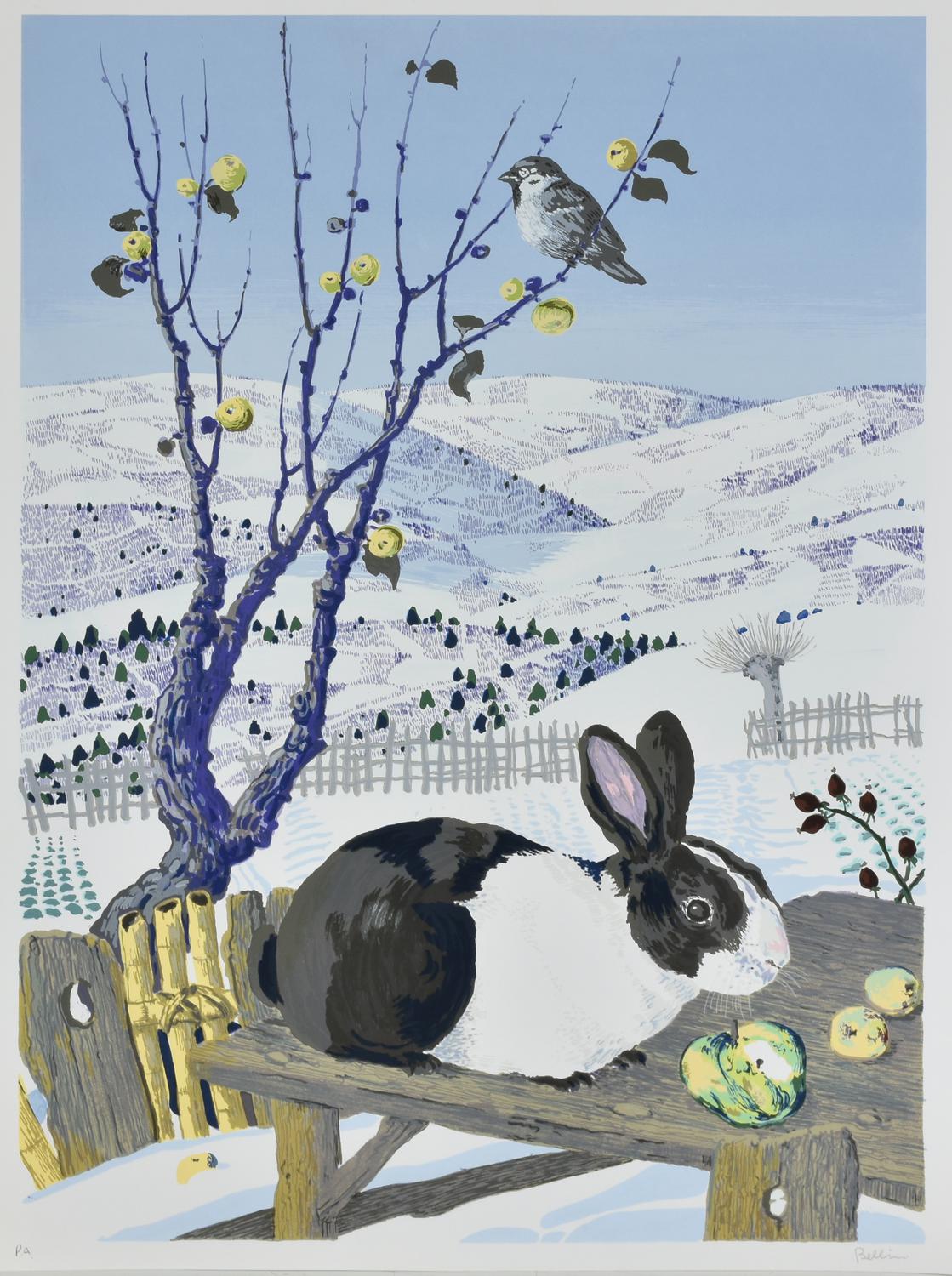 Enzo Bellini IL CONIGLIO E IL PASSERO coppia di serigrafie su carta, cm 70x50...