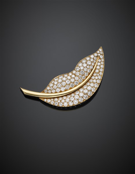 Broche a guisa di foglia in oro giallo e diamanti rotondi per complessivi ct. 6 circa, dettagli in oro bianco, g 12,30 circa, lungh. cm 5,40 circa. Firmato e marcato Van Cleef & Arpels, marchi francesi, n 37121.
