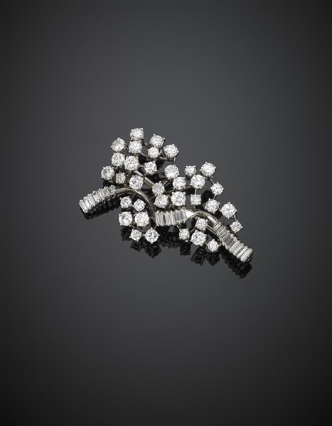 Round and baguette cut diamond white gold brooch, yellow gold detail, in all ct. 5.50 circa, g 11.30 circa, length cm 4.70 circa. Marked 225 FI.