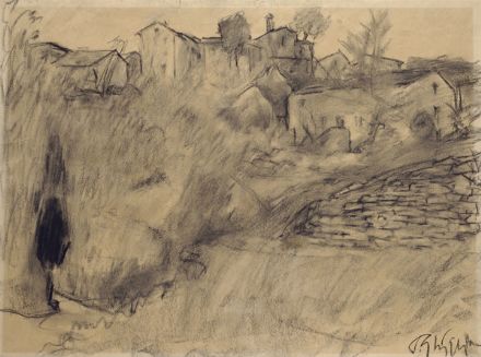 Paulo Ghiglia (Firenze, 1905 - Roma, 1979) Paesaggio con case Carboncino su carta, cm. 41,5x55,5 Firma in basso a destra.