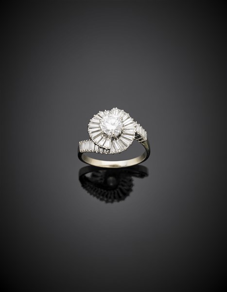 Round ct. 0.95 circa diamond and tapered diamonds white gold ring, g 5.90 circa size 20/60.