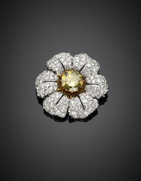 Broche floreale in platino e oro giallo con un diamante "camaleonte" fancy yellow/green di ct. 4,53, sui petali diamanti per complessivi ct. 12,50 circa, g 19,10 circa.