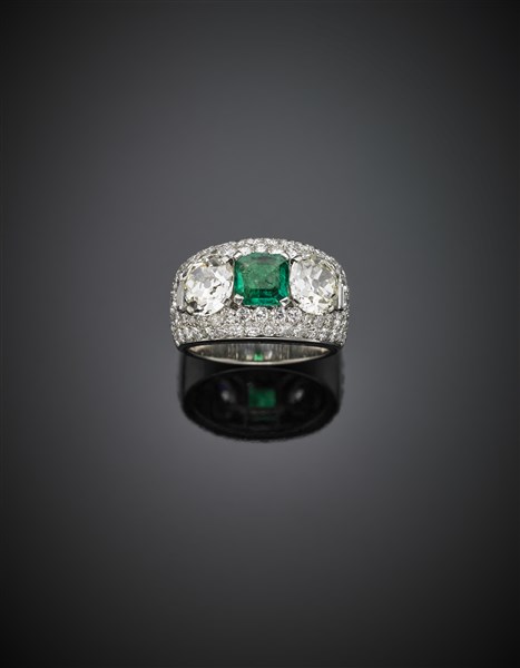 Anello in platino con due diamanti rotondi di ct. 1,50 circa l'uno e uno smeraldo a gradini di ct. 0.85 circa rifinito con diamanti a pavè e piccole baguette, diamanti per complessivi ct. 5,50 circa, g 13,90 circa misura 14/54. Firmato Bulgari. In scatola originale