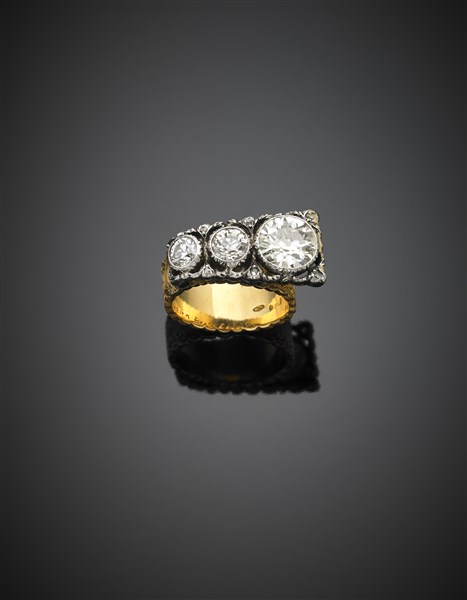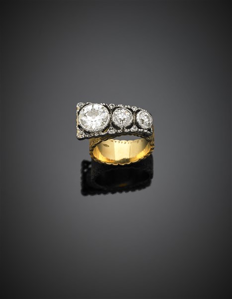 Anello in oro giallo e bianco satinato con tre diamanti a scalare per complessivi ct. 2,20 circa, il più grande di ct 1.40 circa g 8,50 circa misura 7/47. Firmato e marcato Federico Buccellati, 1169 MI.