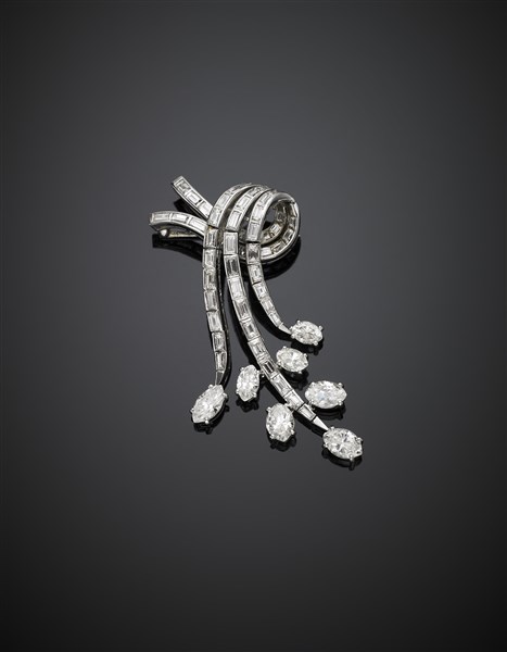 Spilla a volute mobili in oro bianco con diamanti baguette e navette , per complessivi ct. 6,70 circa, g 15,74 circa, lungh. cm 5,90 circa.