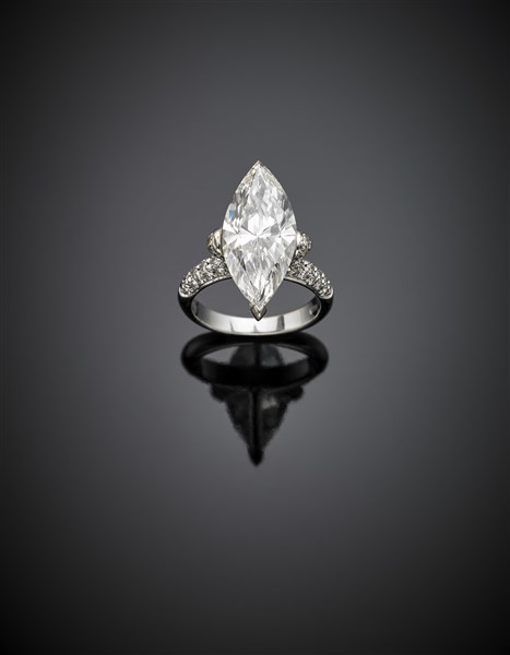 Anello in oro bianco con diamante a navette di ct. 5,02, piccoli diamanti roton