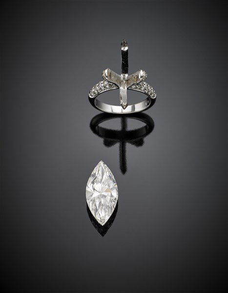 Anello in oro bianco con diamante a navette di ct. 5,02, piccoli diamanti rotondi sul gambo, g 5,83 circa misura 9/49. Marcato 2159 AL.