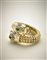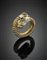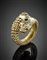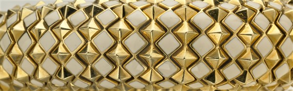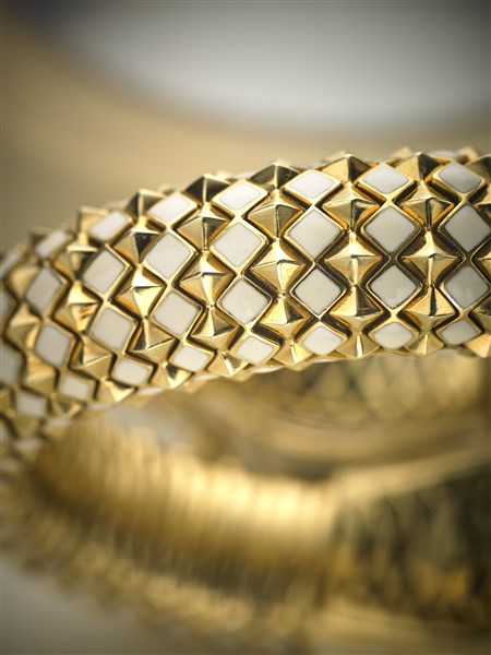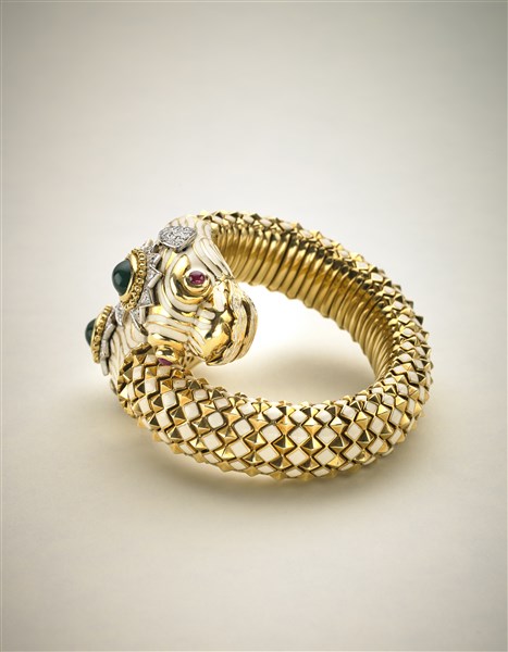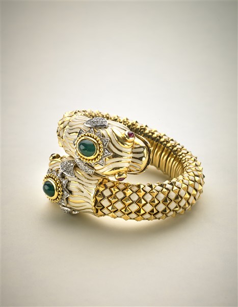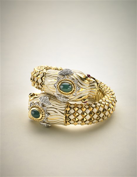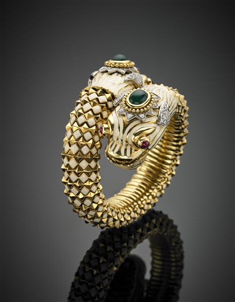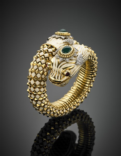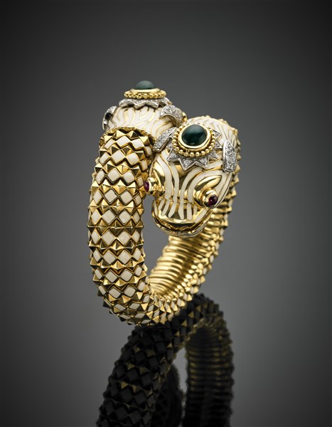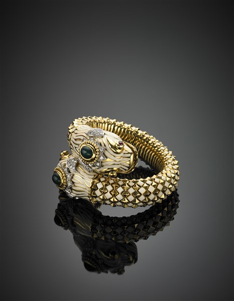 Bracciale in oro giallo a contrariè con due draghi rifiniti in smalti, due pietre verdi cabochon, rubini per gli occhi e diamanti per complessivi ct. 2 circa, g 210 circa, diam. cm 5,50 circa. Firmato Webb.