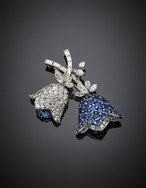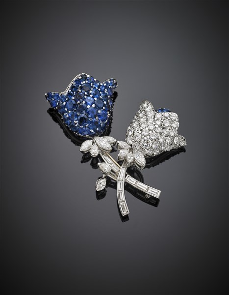 Spilla in oro bianco con diamanti per complessivi ct. 6,50 circa e zaffiri per complessivi ct. 5,5 circa a guisa di campanule, g 20,40 circa, lungh. cm 6 circa.