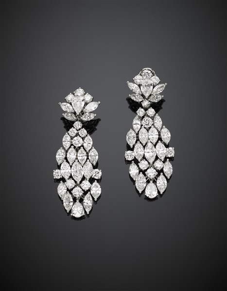 Lot 409 | Orecchini pendenti in oro bianco con diamanti rotondi, navette e a goccia per c