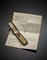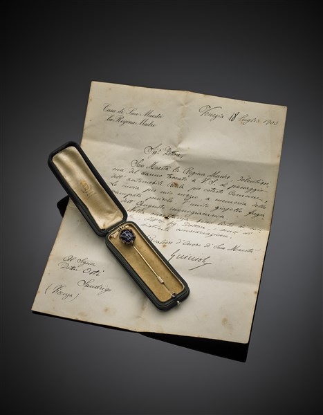 Jabot pin present of Her Majesty the Queen Mother Margherita Savoia as excuses for the "Unfortunate accident". Diamond, ruby and blue enamel silver and gold jabot pin with Her regal monogram, g 5.20 circa, length cm 7 circa. Signed Cagli Roma Lucerna. Appended letter signed by Her Majesty Honor Knight dated July 18th 1903 Venice. In original case