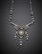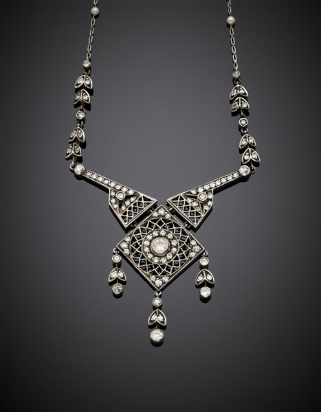 White gold seed pearl necklace with round diamond 9K gold and silver articulated central pendant, the central diamond ct. 0.40 circa, g 14.80 circa, length cm 57.50 circa.