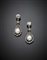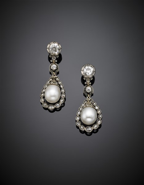 Old mine and rose cut diamond mm 12.90/13.20 circa cultured pearl silver and 9K gold garland pendant earrings, the two main diamonds ct. 1.40 circa and ct. 1.10 circa, old mine diamonds in all ct. 6.30 circa, g 22.20 circa, length cm 5.70 circa.