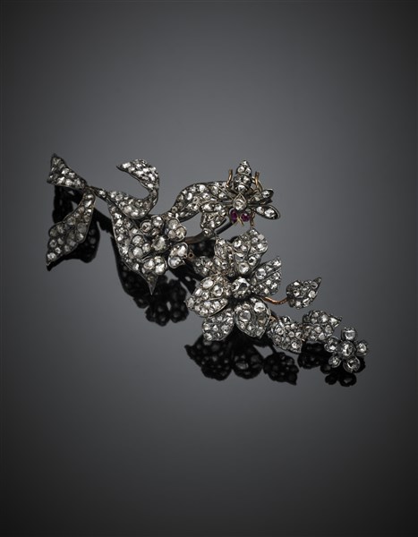 Rose cut diamond silver and gold floral brooch with a ruby eye insect en tremblant, diamonds in all ct. 9.50 circa, g 23.60 circa, length cm 9.70 circa. Cased by Chiaravalli
