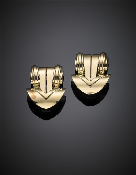 Lot 430 | Orecchini oro giallo a cartiglio, g 21 circa, lungh. cm 3,40 circa. Marchio fra
