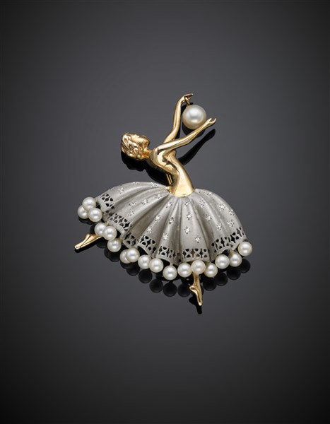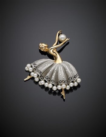 Spilla a ballerina in oro bianco e giallo 500/1000 in parte satinato, rifinita con perle e piccoli diamanti. g 17,10 circa, lungh. cm 5,80 circa. Con scatola originale