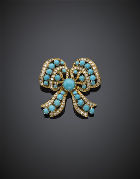 Broche a fiocco in oro giallo con diamanti e turchesi, g 14,30 circa, lungh. cm 3,30 circa.
