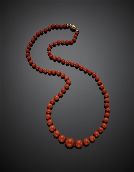 Red orange coral graduated bead necklace with yellow gold clasp, bead diam. from mm 6.30 to mm 15 circa, g 59.40 circa, length cm 70.40 circa.