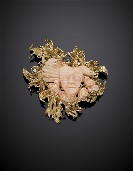 Yellow 9K gold and carved pink coral brooch accented with diamonds in all ct. 0.60 circa, g 99.40 circa, length cm 8.20 circa. In original box and packaging