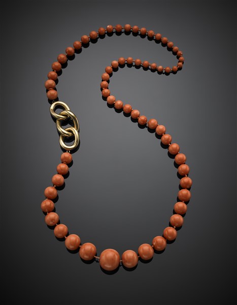 Orange coral graduated bead necklace with three yellow gold links, without clasp, bead diam from mm 5.50 to mm 19.10 circa, g 120.40 circa, length cm 56 circa.