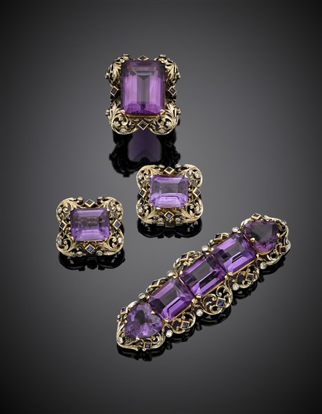 Demi parure in oro giallo e bianco cesellati con ametiste per complessivi ct. 71 circa, zaffiri e diamanti composta da broche di cm 7,1 circa, orecchini di cm 2,1 circa e anello misura 14/54, complessivi g 68,16 circa. Firmati Trab. In scatola della Gioielleria Sommariva.
