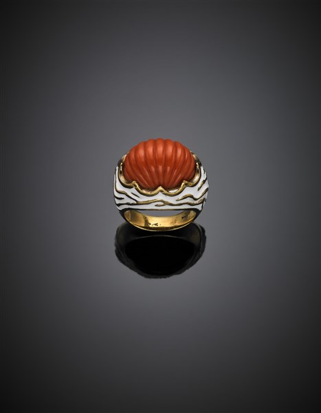 Carved orange coral and white enamel yellow gold ring, g 17.50 circa size 14/54. In original fitted case