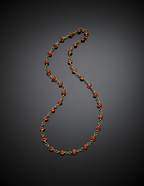 Lunga collana in oro giallo e boule di corallo arancione, g 58,00 circa, lungh. cm 71 circa.