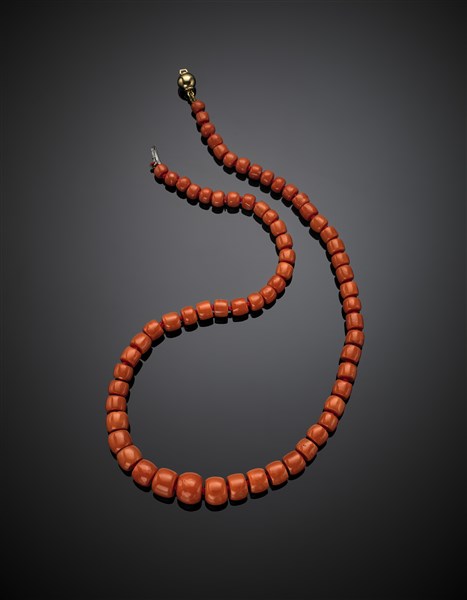 Graduated orange coral bead necklace with bi-coloured gold clasp, bead from mm 6.00 to mm 13.90 circa, g 64 circa, length cm 54.50 circa. Marked 31 PR.