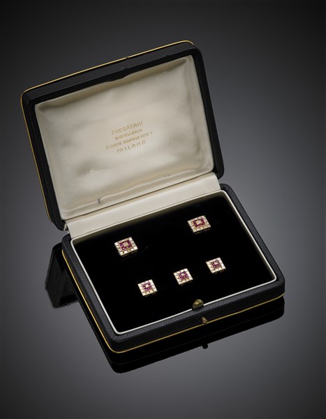 Gemelli e bottoni da sparato in oro giallo, diamanti per complessivi ct. 2,60 circa e rubini sintetici, g 14,90 circa. In scatola Pederzani Milano