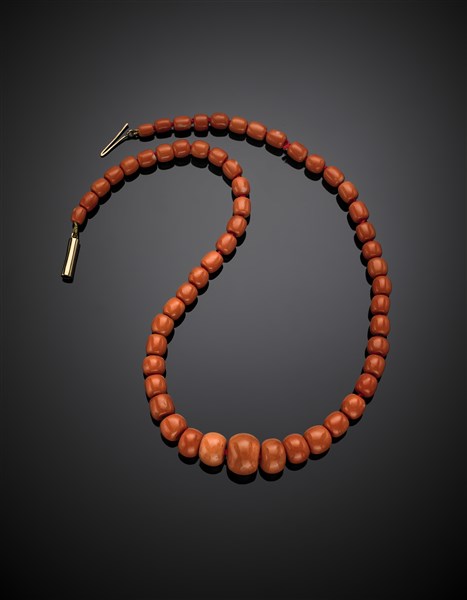 Graduated orange coral bead necklace with yellow gold clasp, bead from mm 5.85 to mm 18.60 circa, g 86.70 circa, length cm 58.80 circa.