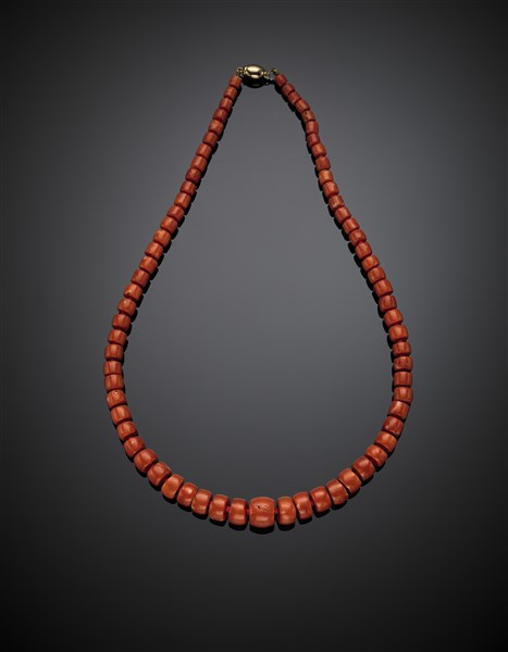 Graduated red coral bead necklace with bi-coloured gold clasp, bead from mm 5.10 to mm 14.40 circa, g 74.60 circa, length cm 58.50 circa. Marked 31 PR.