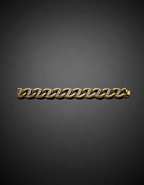 Bracciale a maglia marinara in oro giallo rifinito con diamanti per complessivi ct. 1,20 circa, g 93,80 circa, lungh. cm 18,80, h cm 1,60 circa. Marcato 186 TO.