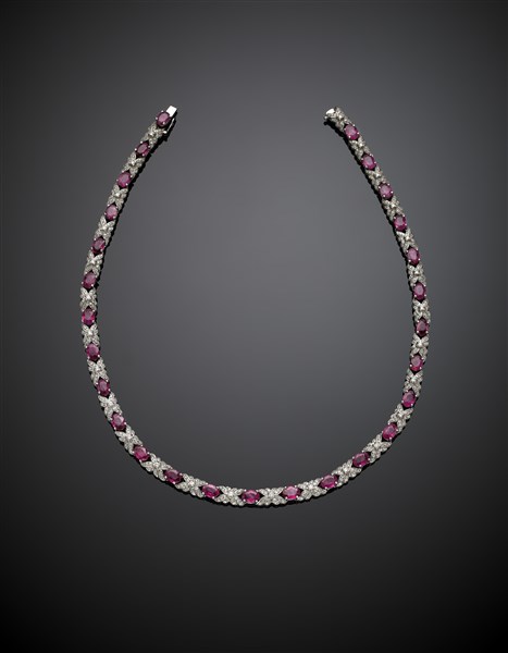 Collier modulare in oro bianco con diamanti per complessivi ct. 3,50 circa e rubini ovali per complessivi ct. 27 circa, g 53,99 circa, lungh. cm 43,40 circa. Firmato Giulio Veronesi. In custodia originale con garanzia