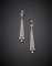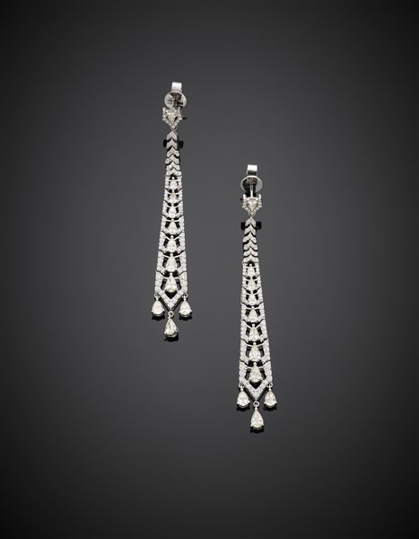 Orecchini pendenti in oro bianco, diamanti a goccia e rotondi, per complessivi ct. 3 circa, g 8,15 circa, lungh. cm 6,80 circa.