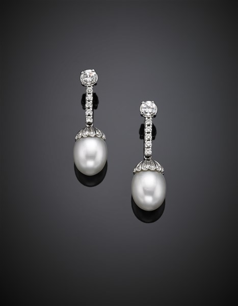 Orecchini pendenti in oro bianco, diamanti e perle South Sea ovoidali di mm 14.00x12.90 circa, diamanti per complessivi ct. 2 circa di cui i due maggiori di ct. 0,75 circa l'uno, g 17,29 circa, lungh. cm 4,20 circa.